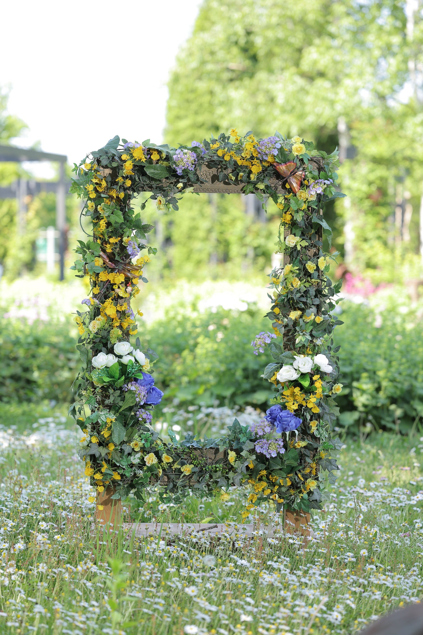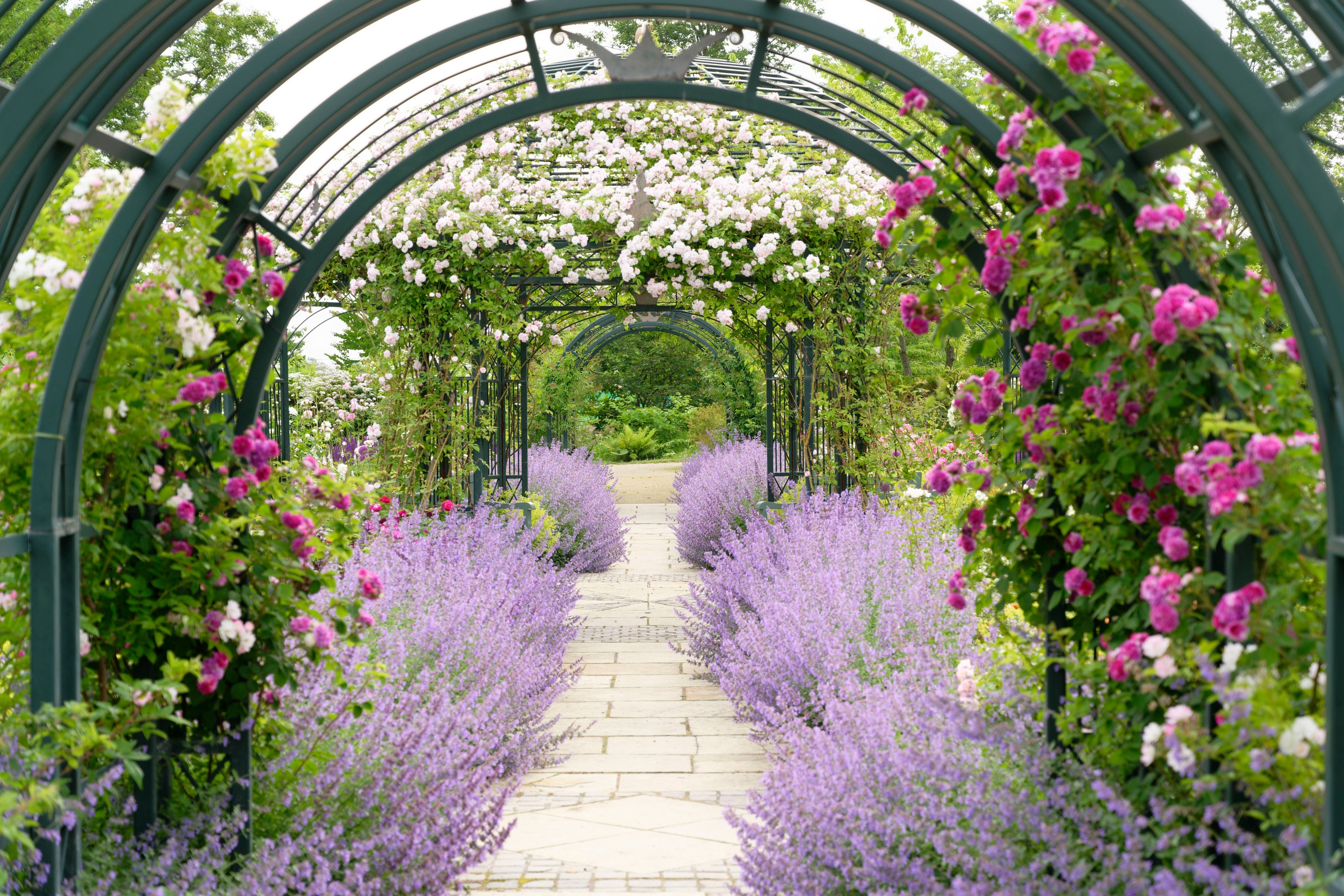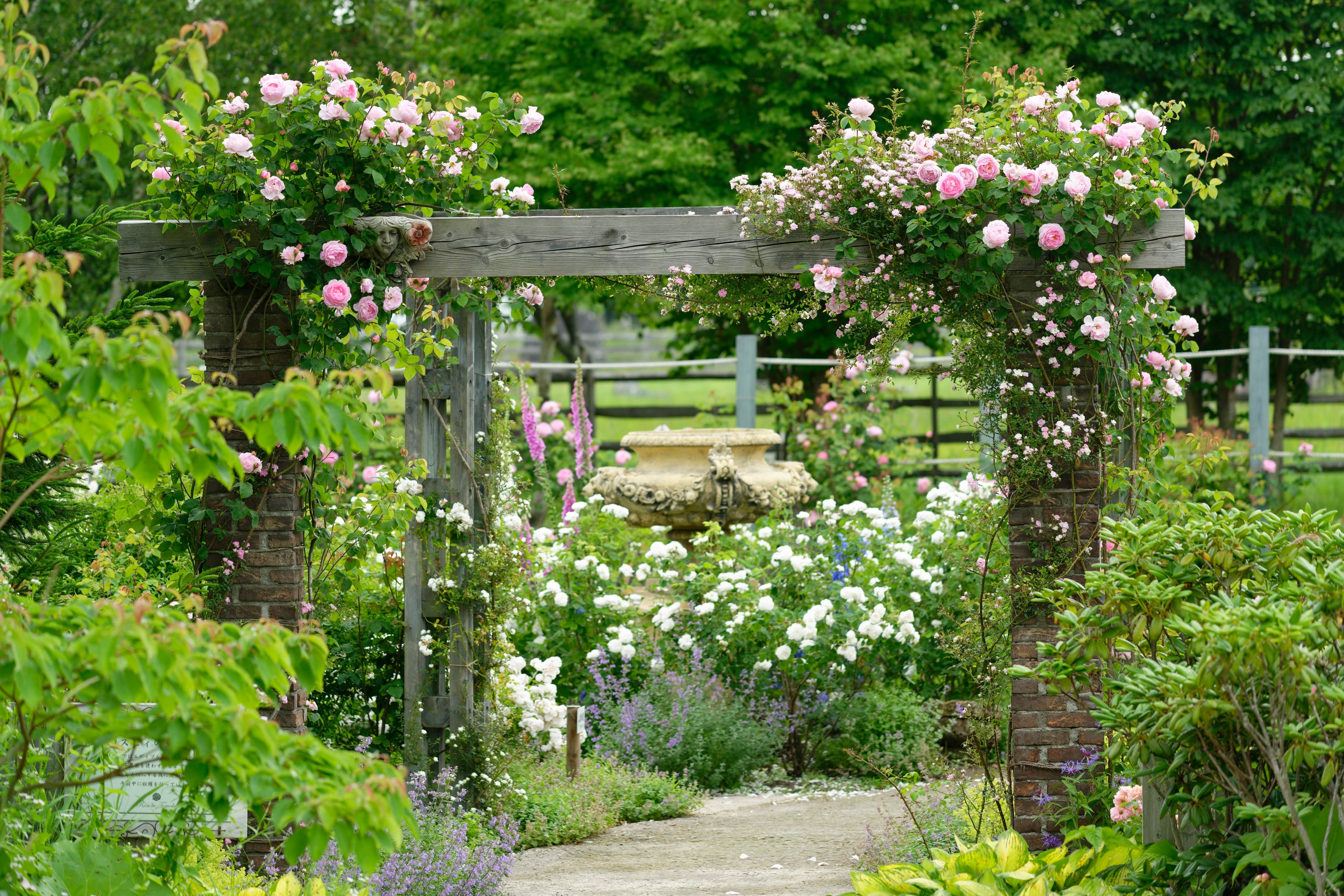 ローズビィのバラ畑には、オブジェとバラのフォトスポットがたくさんあり、お気に入りの場所を見つけて写真撮影するのがおすすめです。ここでの見どころは、連続アーチに咲くツルバラ「コンスタンス・スプライ」。イングリッシュローズ第一号のバラで、ミルラの香りを持つ大変美しいバラです。また、吉谷桂子先生プロデュースのフォトスポット・ローズフレームが完全リニューアルしましたので、こちらもご注目ください。