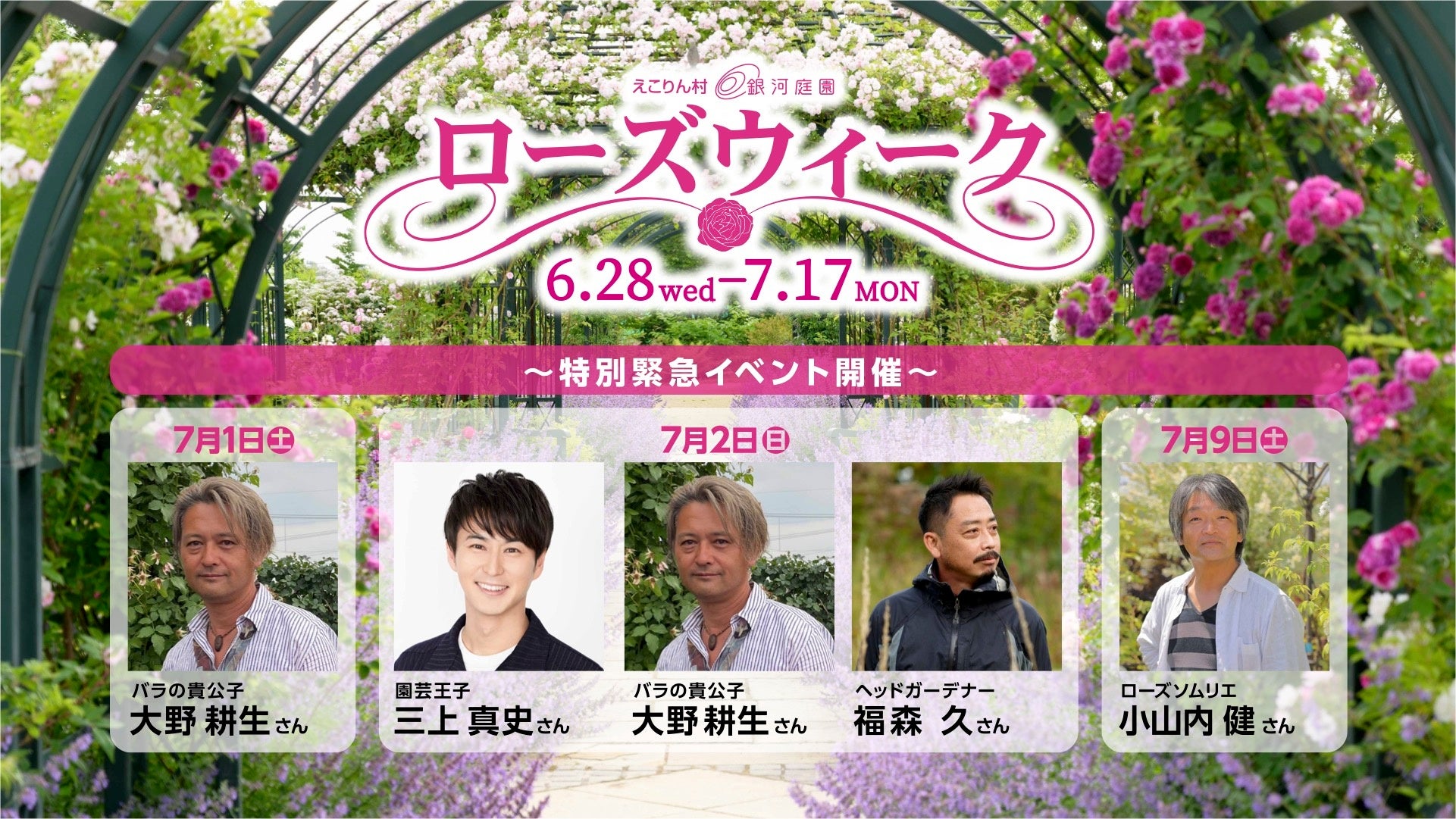園芸王子・三上真史さん、バラの貴公子・大野耕生さん、ヘッドガーデナー・福森久雄のツナギブラザーズによる園芸トークショーをお楽しみください。●無料(入園料のみ)
