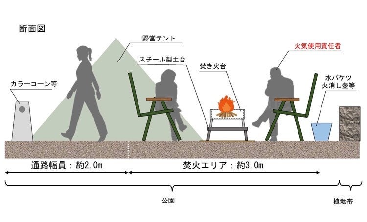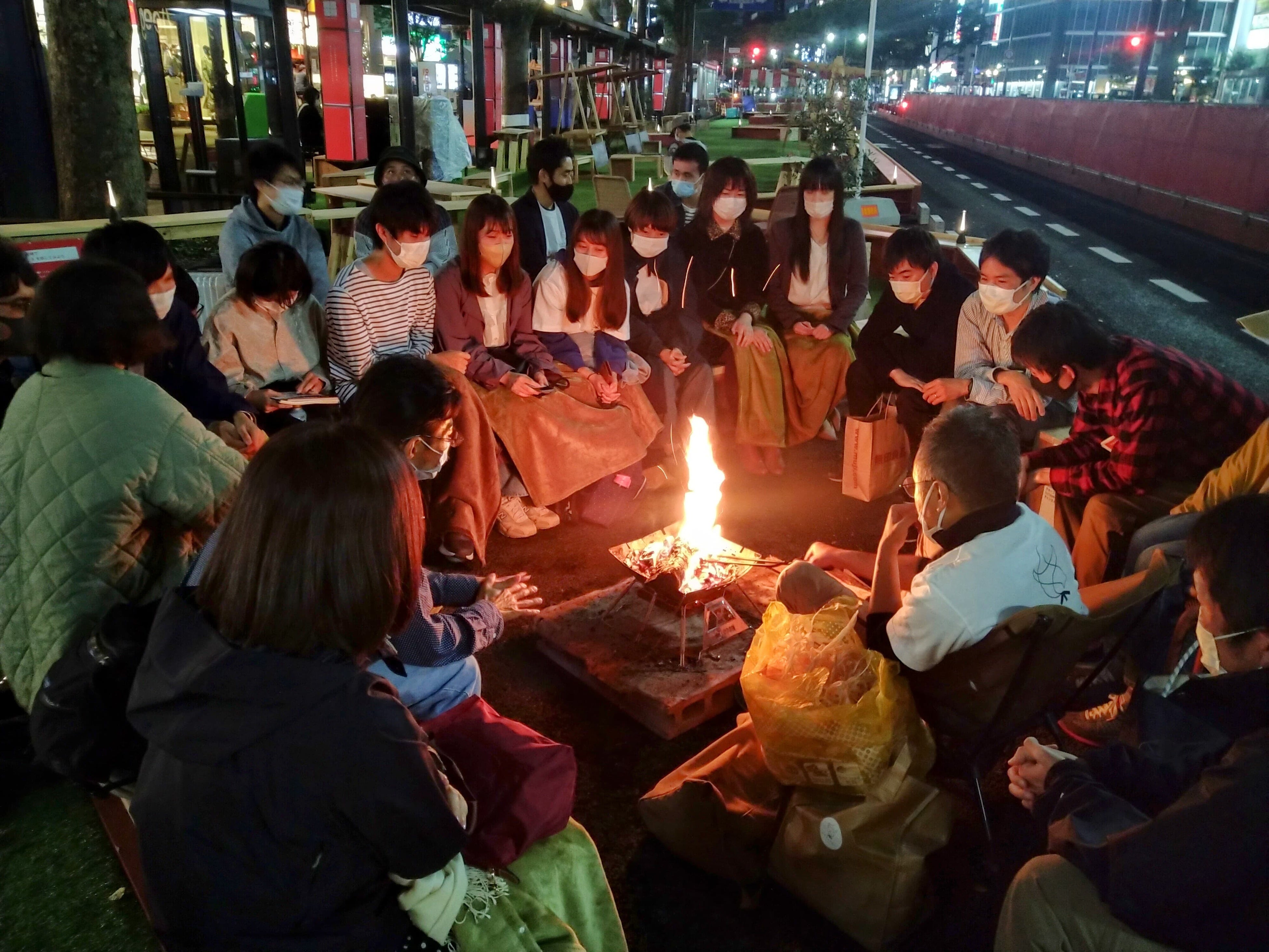 『YOBOU 夜を安全にあそぼう(野営と焚火の対話会)』では、勾当台公園の円形広場の一角に野営テントと焚火を設け、みんなで防災について語り合い、安全に一夜を過ごす宿泊型の体験イベントを開催します。