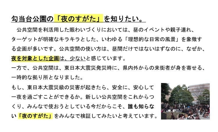 公共空間は、東日本大震災発災時に県内外からの来街者が身を寄せる、一時的な拠り所となりました。有事の際活用する場所は公共空間が多いにも関わらず、公共空間でのイベントは昼間のものが多く、夜間に開催されるものは多くありません。仙台市で新しい公共空間をこれからつくり、みんなで使おうとする今だからこそ、誰も知らない「夜のすがた」を検証します。
