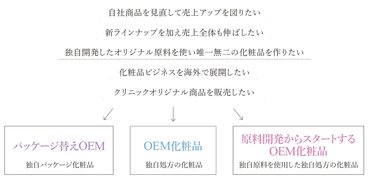 お客様のオリジナル化粧品(PB)を長年開発・製造してきたベル・クール研究所は既存のラベル替えOEMと、処方を一から組み立てるOEM化粧品事業に加え、現在高まる唯一無二の差別化された商品のニーズに対し、独自の新規化粧品原料開発からスタートするOEM化粧品事業を展開しております。