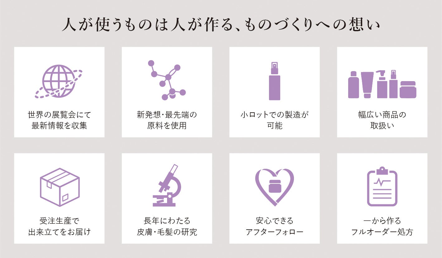 店販品10個、業務用3個からOEMを受け付けております。職人技術やノウハウによって、 お客様のご要望に応じたオリジナル化粧品を製造するだけでなく、薬機法についてのご指導など、製品を発売するまで多方面からサポートいたします。