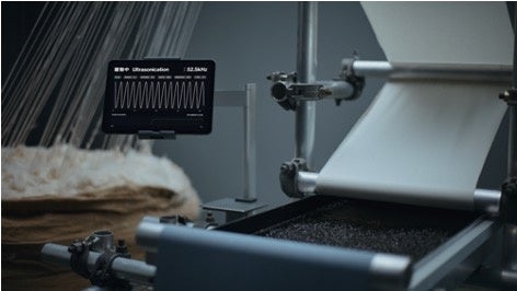 AIZOME ULTRAを用いたプロセスでは、まず、52.5kHzの超音波によって染液の中に0.1 mm以下の無数のマイクロバブルを生成し、染液を撹拌します。その後、藍をはじめとする染色用の材料を投入、混合します。この際、超音波によって藍の成分が均一に分散します。その後、綿玉を染液の中に入れ、少しだけ時間をおきます。この時にも、藍の成分が超音波によって繊維深くに浸透し、強固に付着します。これによって、化学物質を一滴も使わずに、従来の藍染の課題であった「色落ち」や「薬用効果の低下」を防ぐことができるのです。その後は通常の紡績と同様に、染められた綿玉は糸として紡がれ、織りを経たのち、縫製されて商品になります。