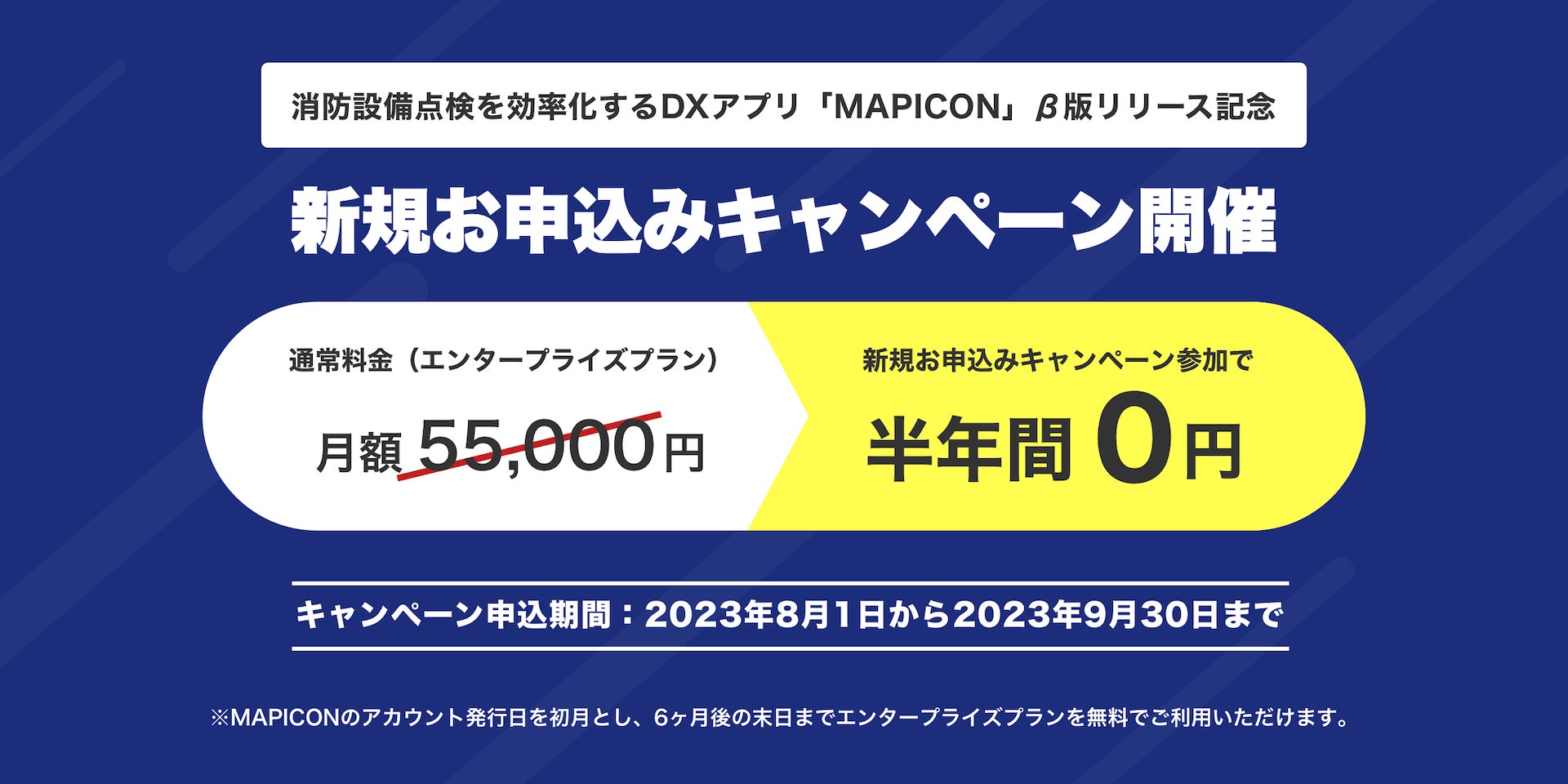 消防設備点検を効率化するDXアプリ「MAPICON」β版のキャンペーンを8月1日から9月30日まで期間限定で開始!アカウント登録から半年間は最上位プランが無料で利用可能!
