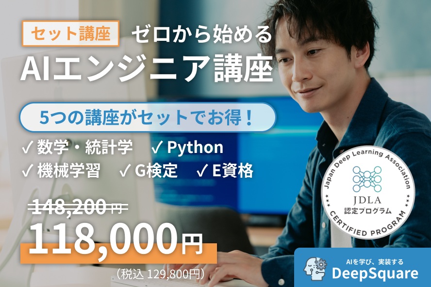 DeepSqure「ゼロから始めるAIエンジニア講座セット」は、主力講座のE資格講座に加え、G検定講座、数学・統計学講座、Python講座、機械学習講座の5つの講座がセットになっています。