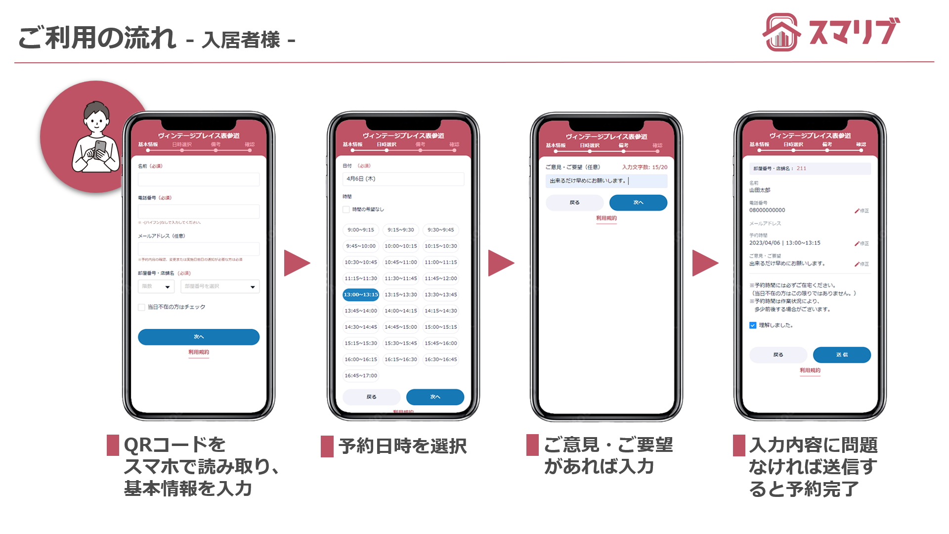 管理会社様や協力会社様から実施のお知らせやメールに記載された二次元コードやURLをスマートフォンで読み込む事で、いつでも日時調整が可能となります。