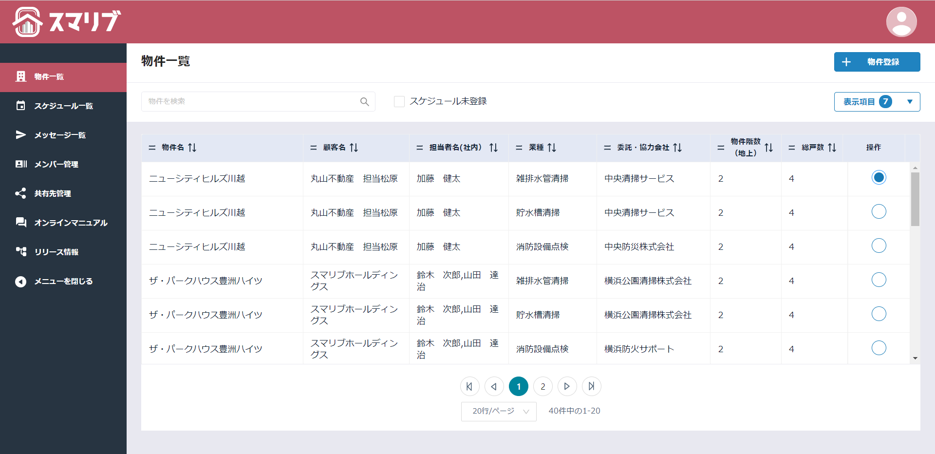 スマリブ契約者様が使用する画面で、建物情報や不随する点検のスケジュールを一元管理できます。