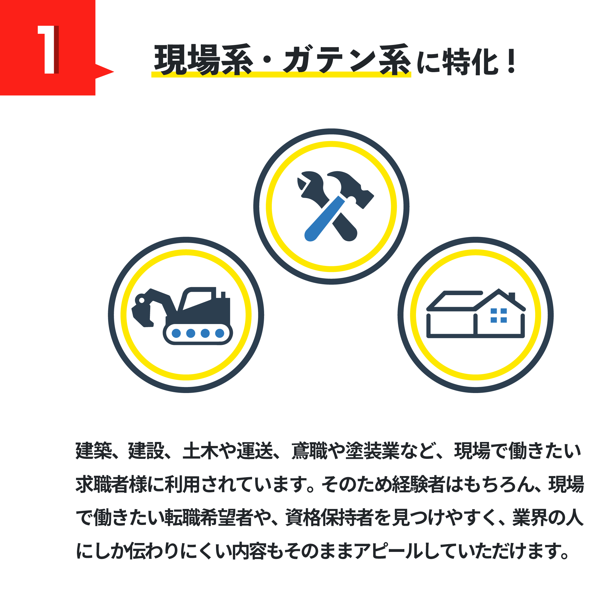 求人サイト『GATEN職』』は、土木建築、運輸倉庫、農林水産など、現場系ワーカーに特化した求人サイト