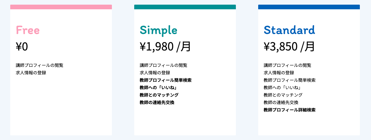 Free(0円)/Simple(1,980円/月)/Standard(3,850円/月)の3段階の会員ランクがあります。