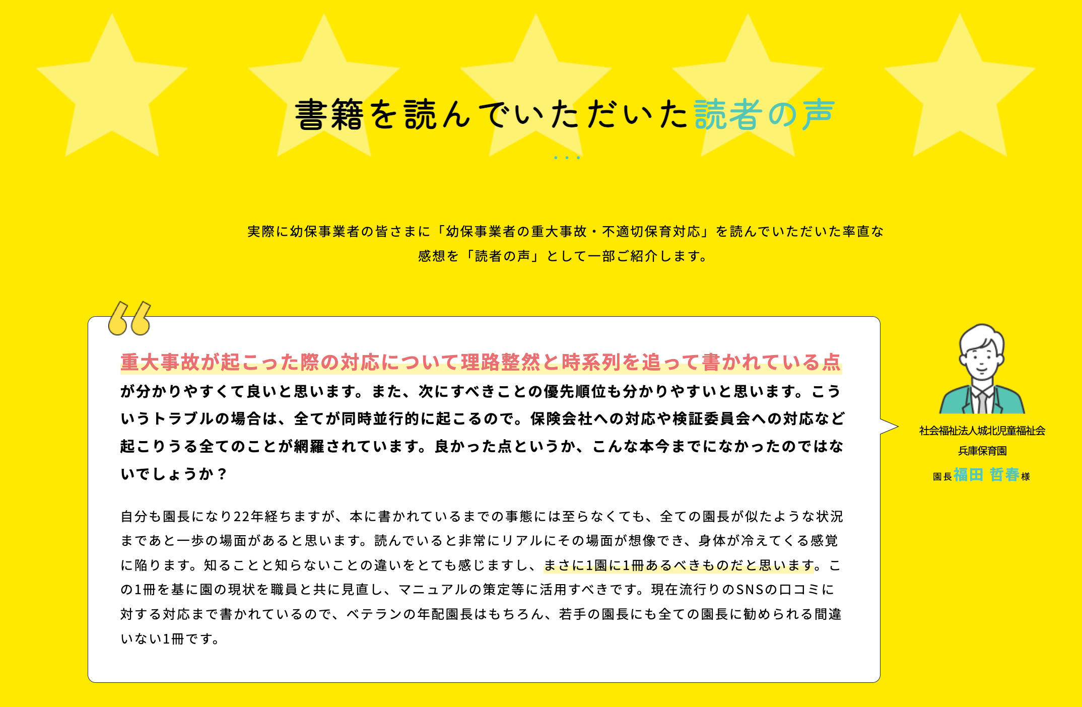 この書籍が少しでも日本の幼保事業の現場の改善につながれば、著者冥利、幼保業界に特化した弁護士冥利に尽きる次第です。