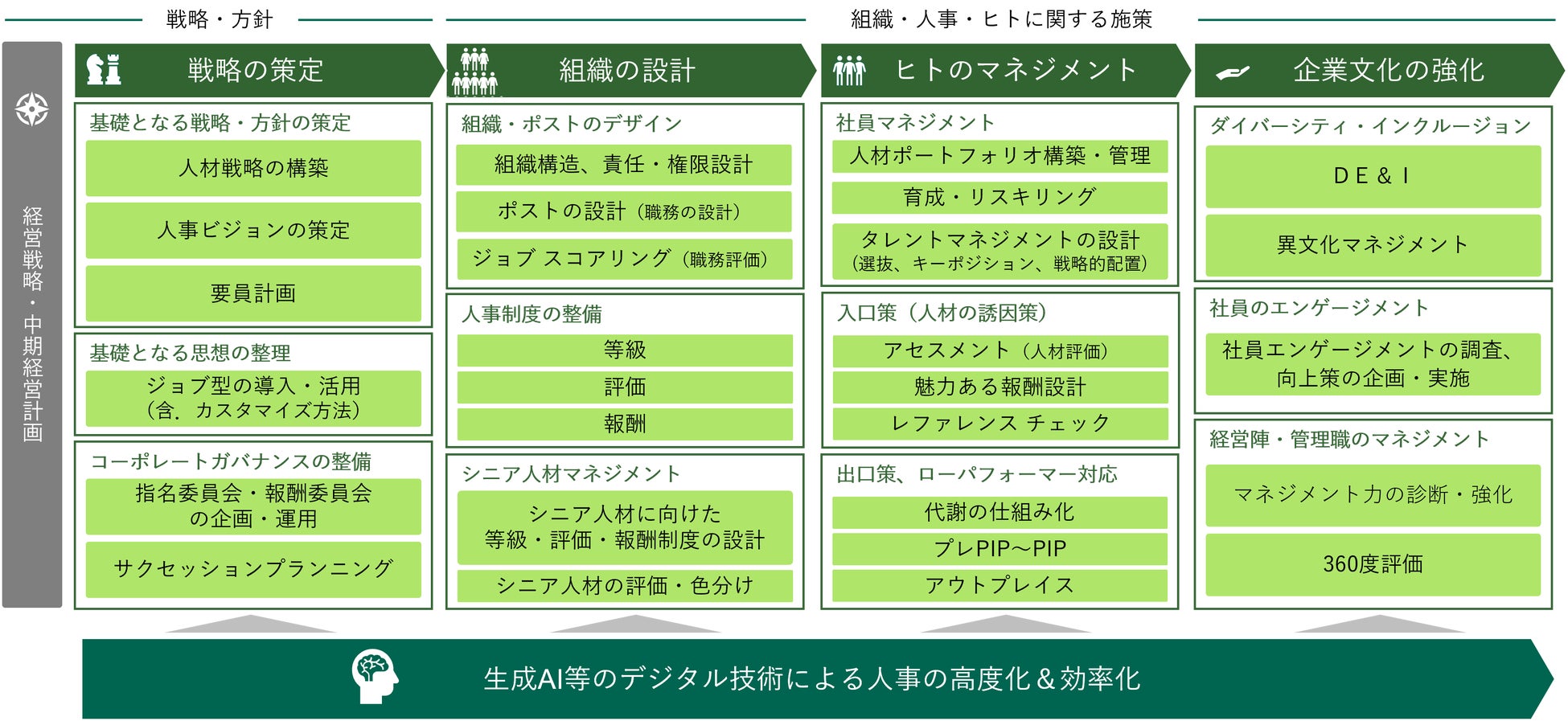ChatGPTなど生成AIのほか、機械学習、自然言語処理等のデジタル技術を用いて、企業の組織・人事機能(CoE、HRBP、HRSS)の高度化&効率化をご支援