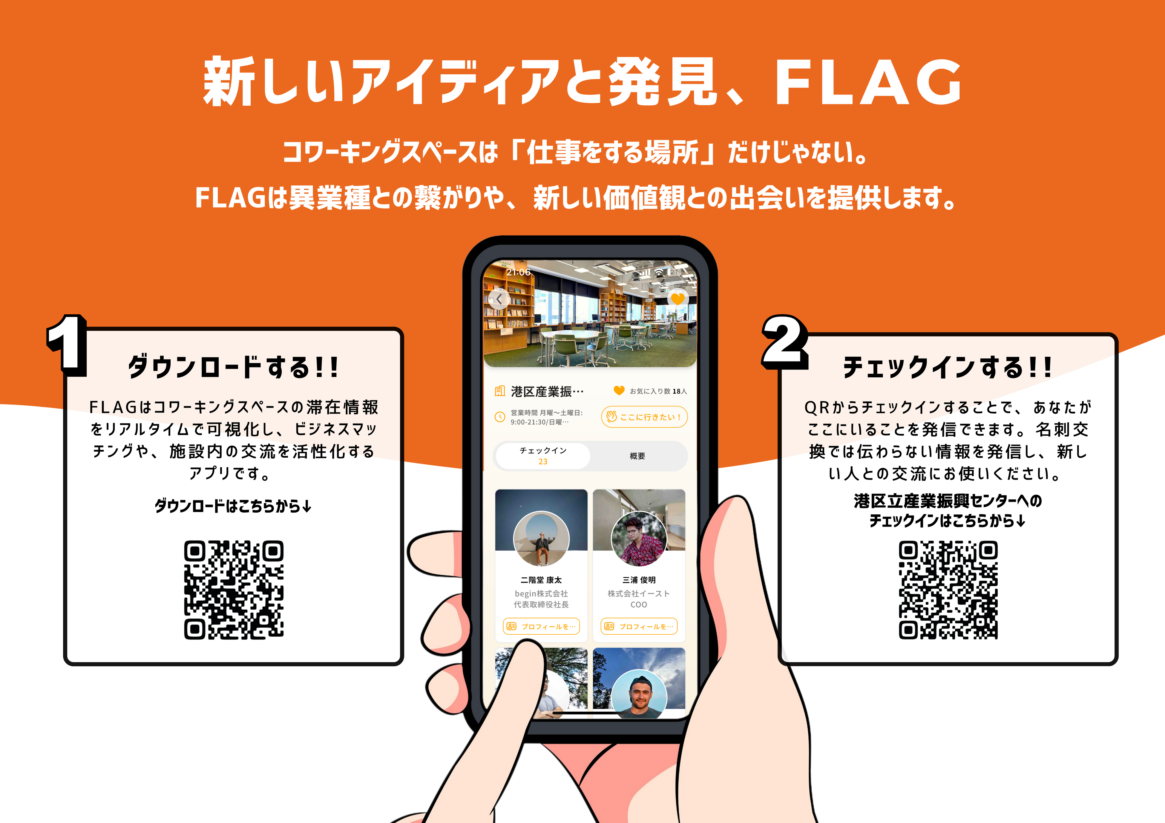 FLAG(以下、本アプリ)は、自身の検索したいエリア内および施設内にどのようなコミュニティやイベント、滞在しているユーザーがいるのかという情報を、リアルタイムで可視化するアプリです。今回、本アプリが連携する港区立産業振興センターは、国内でも有数の法人数を誇る東京都港区にて、スタートアップ向けのサポート施設を開設する区内のビジネスマンの中枢拠点の役割を果たす施設です。