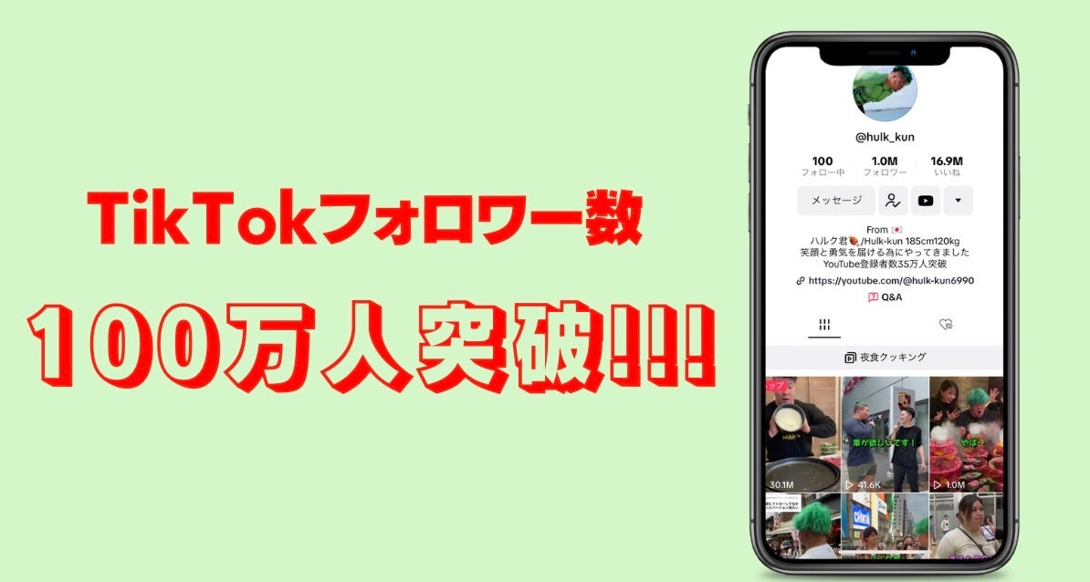 Z世代に絶大の人気を誇るハルク君がフォロワー数100万人達成!