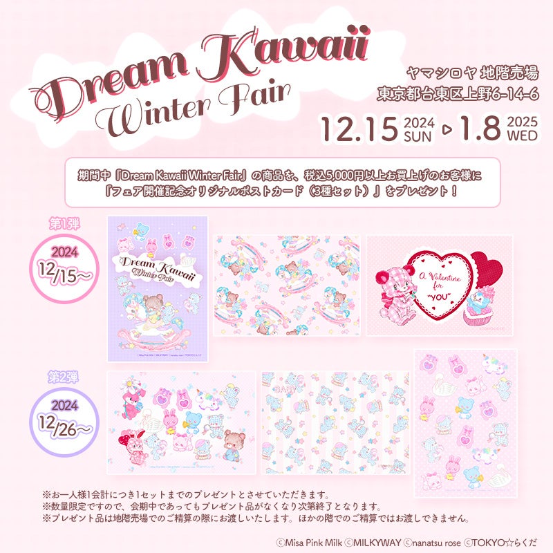 期間中、『Dream Kawaii Winter Fair』で、対象商品を税込5,000円以上お買上げのお客様に『フェア開催記念オリジナルポストカード(3種セット)』を差し上げます。