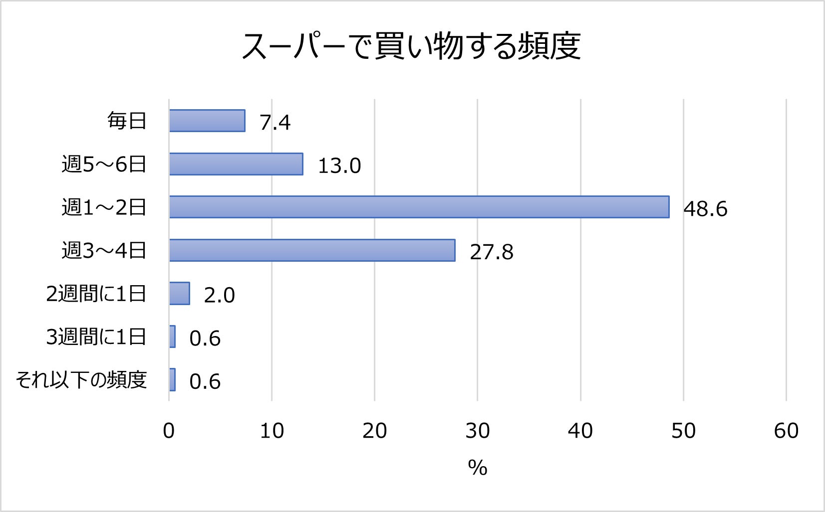 食品や日用品などを多数扱い、生活とは切っても切り離せないスーパーマーケット。スーパーで買い物の頻度を質問したところ、最も回答が多かったのは「週1~2日(48.6%)」、続いて「週3~4日(27.8%)」という結果でした。「毎日(7.4%)」と回答した人も一定数おり、ほとんどの主婦・主夫は、週に1回以上スーパーへ行くことが分かりました。
