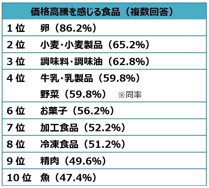- 2.価格高騰を感じる食品1位「卵」 2位「小麦・小麦製品」 3位「調味料・調味油」