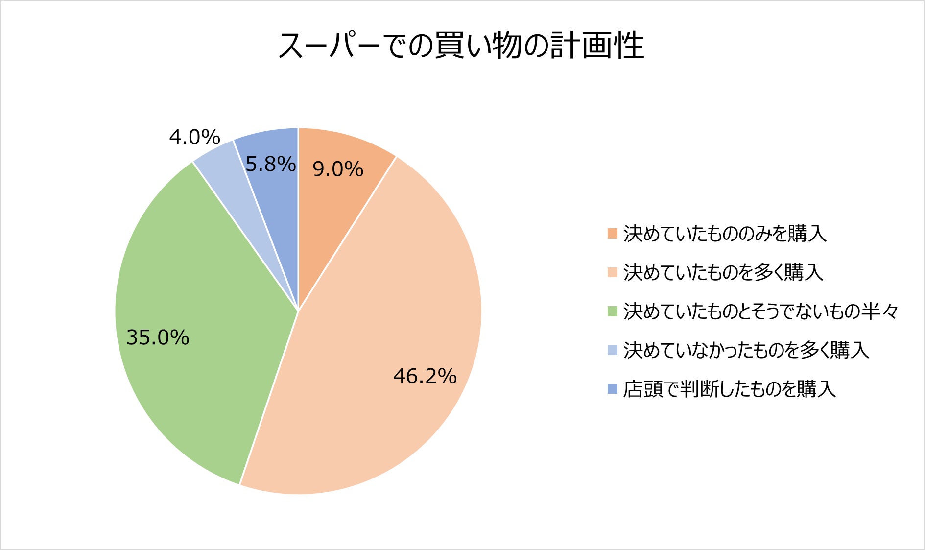 スーパーでの買い物の計画性に関する質問では、「決めていたものを多く購入(46.2%)」という回答が多数派でした。次に多かった「決めていたものとそうでないもの半々(35.0%)」は、3人に1人以上が回答。「決めていたもののみを購入(9.0%)」と回答した人は1割を下回り、逆に言えば、現地で多少なりとも予定になかった商品を購入している人が9割以上いることが分かりました。