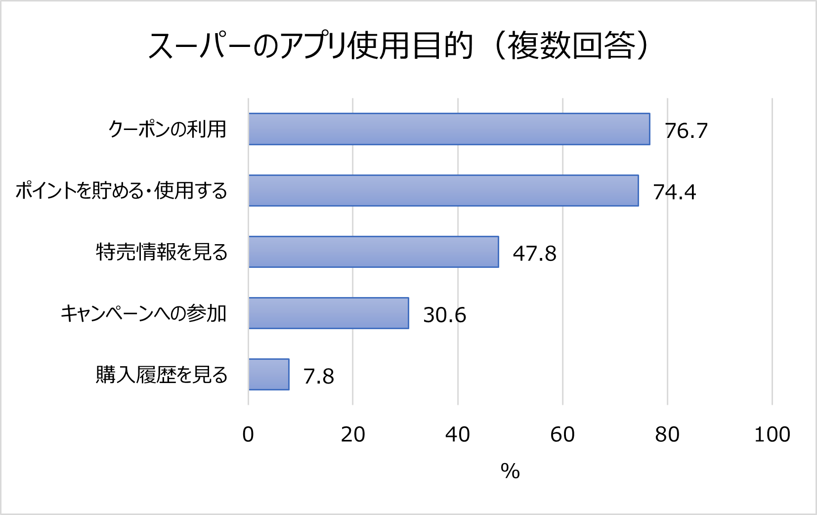 現在では、多くのスーパーでスマートフォンアプリを導入しています。よく利用するスーパーのアプリをダウンロードしているのか質問しました。結果はダウンロード「している(36.0%)」人は4割弱ほど。3人に1人以上はダウンロードしていました。アプリの使用目的で最も多かったのは「クーポンの利用(76.7%)」、続いて「ポイントを貯める・使用する(74.4%)」「特売情報を見る(47.8%)」。お得に買い物することを目的とした人が多くいました。