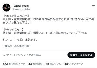 きっかけは2022年2月14日に天鷹酒造【九尾】TwitterがVTuberとそのファンに向けてつぶやいた「私、コラボに本気です」というツイート。様々なVTuberがSNSで反応したりライブ配信中に話題に出すなど、1万いいねを超える大きな反響を呼び、そのツイートをきっかけにホロライブと天鷹酒造のコラボ商品開発がスタートしました。