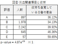 相関は病気だけに限らない。「貧血関連項目」においては、問診で「体がだるい」、「帰宅後は疲れてゴロゴロしている」、「風邪をひきやすい」のいずれかにチェックを入れた患者は評価Aで36.12%、評価Eで59.65%という結果となり、既に日常生活で疲れを感じている患者に対してヘム鉄のサプリメントを推奨しているが、それを裏付ける結果となった。(図⑧参照)