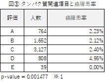 例えば、「タンパク質関連項目」において評価Aだった患者の癌の罹患率が2.23%であったのに対し、評価Dの患者は4.95%であった(図③)。