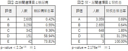 尿素窒素、クレアチニン等を含む「腎・尿関連項目」では、評価Aだった患者の腎疾患罹患率が0.69%であったのに対し、評価Dの患者で58.94%、評価Eは100%の罹患率となった(図②)。