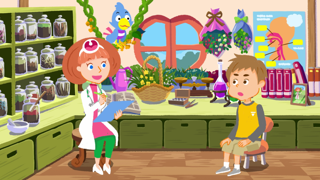 とびっきり元気な、小学6年生のつばさ。ある日、つばさがのどに違和感を感じていると、小鳥のボーチェが現れ、つばさを森の中にある診察室に案内します。到着すると、そこにはのど専門のお医者さんノードン先生がいました。ノードン先生はつばさを歓迎して、リズミカルな歌をうたいます。