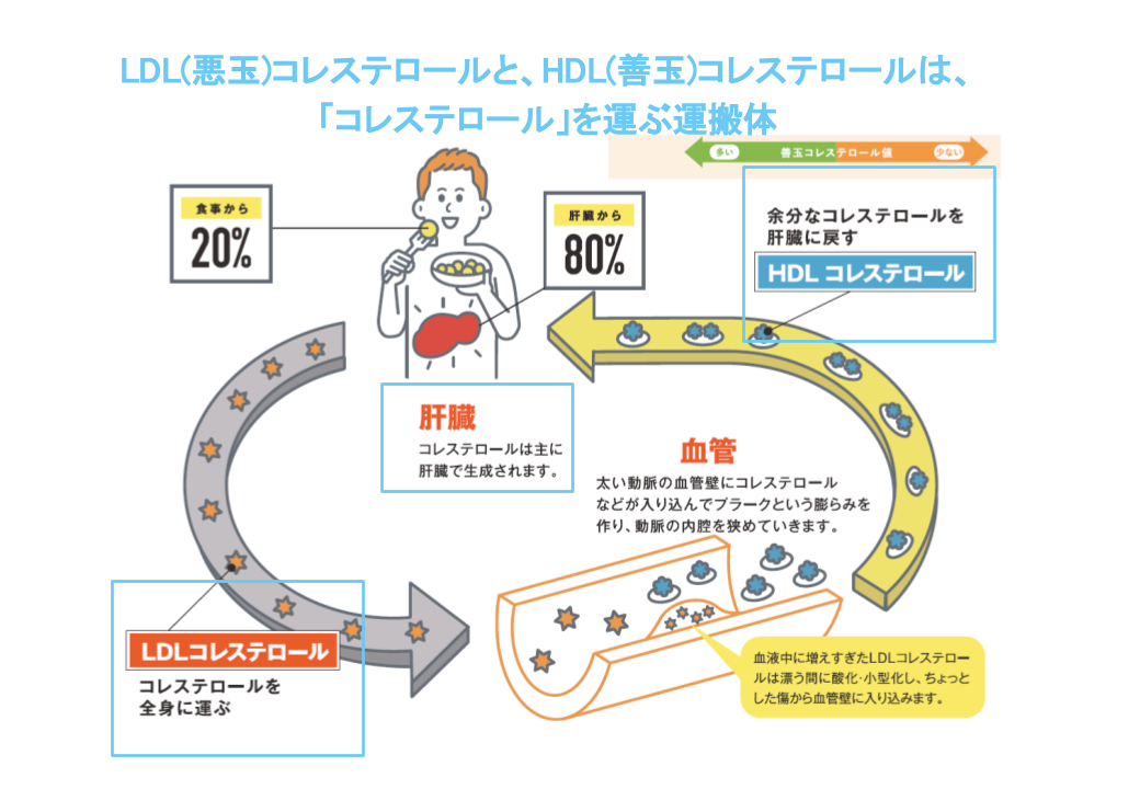 酸化したLDLが血管に残らないよう肝臓に運ぶのがHDLです。HDLは、内膜に詰まった過剰なコレステロールを取り込んで、肝臓に戻し身体の外に排出して血管をきれいにする働きをしています。