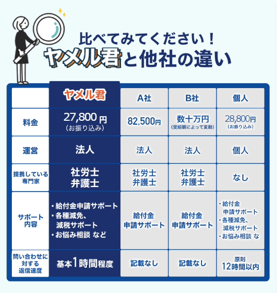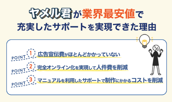 「ヤメル君」は、業界最安値でサービスを提供しています。高額な手数料を払うことなく、プロのサポートを受けることができるため、非常にコストパフォーマンスが高いです。