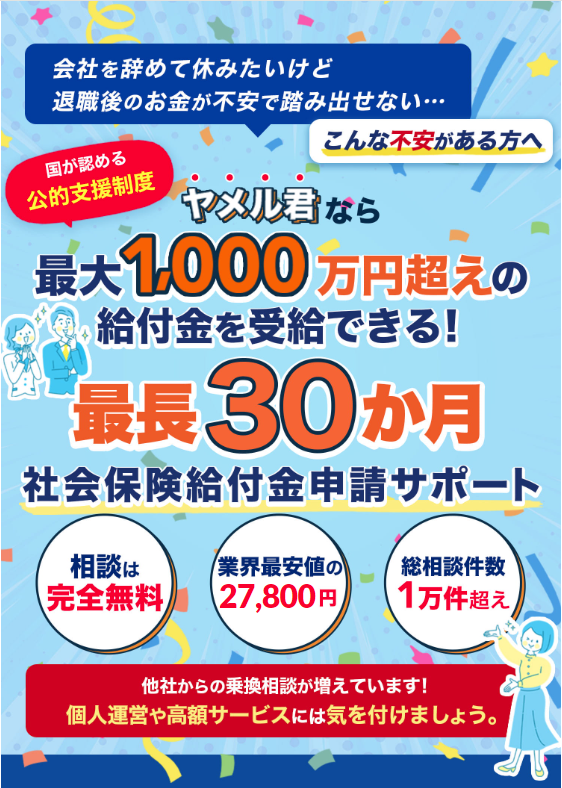 口コミや評判の良い「ヤメル君」で社会保険給付金を簡単申請、業界最安値!最大1000万円受給可能!更なるアップデートへ!2024年7月1日より弁護士との連携の強化を開始