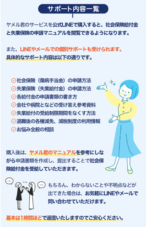 「ヤメル君」には、社会保険給付金の申請に詳しい専門家が揃っています。申請に関する疑問や不安を解消し、確実に給付金を受け取るためのサポートを提供します。