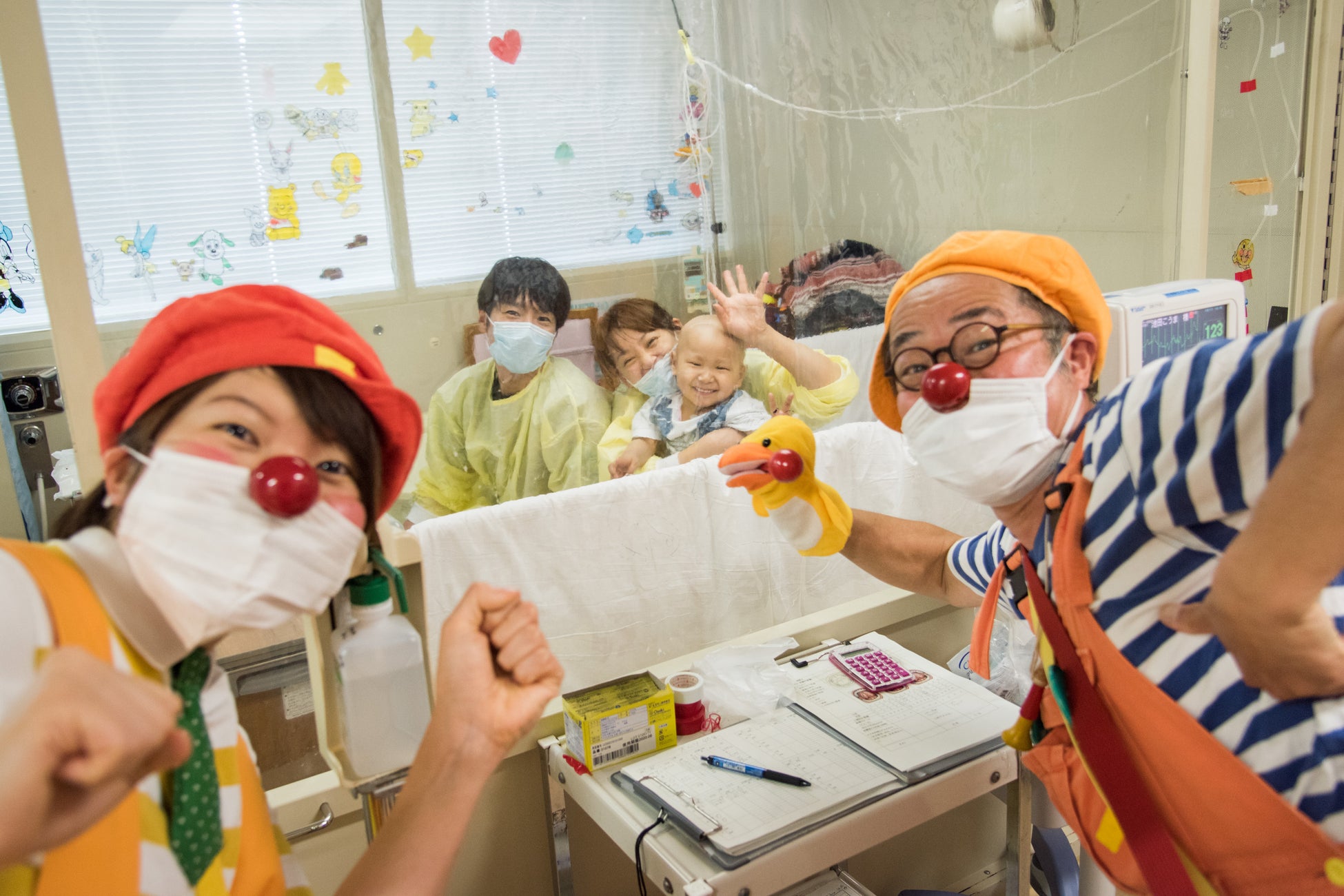 当協会は、小児病棟へ赤い鼻がトレードマークのクリニクラウン(臨床道化師)を定期的に派遣し、入院中のこどもがこどもらしく過ごせる「こども時間」を届けています。クリニクラウンならではの、遊びやコミュニケーションを通じて、こどもの成長や発達を支えるために2005年から活動しています。これまで、全国84病院を3552回訪問し、110985名のこどもたちにこども時間を届けてきました。また、コロナ禍は、感染のリスクなくこども時間を届けたいとクリニクラウンWeb訪問なども実施しています。