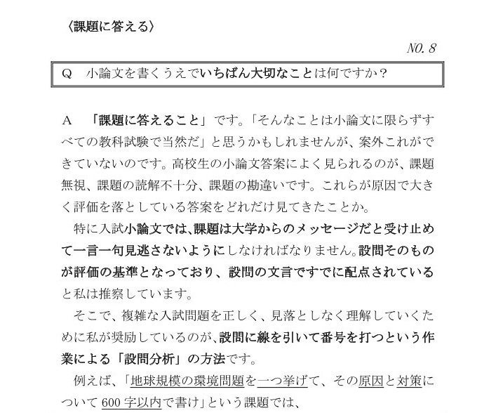 長岡講師の小論文指導において外せないのが「設問分析」です。長岡講師は答案を添削している際に、多くの生徒が問われていることとは異なる答えを書いていることに気づき、「設問は出題者からのメッセージである」と伝えつづけてきました。そのメッセージを受け取って小論文を書くためには、出題者の意図を分析して読むことが必要です。本書では、設問分析の具体的な方法やその重要性について説明しています。