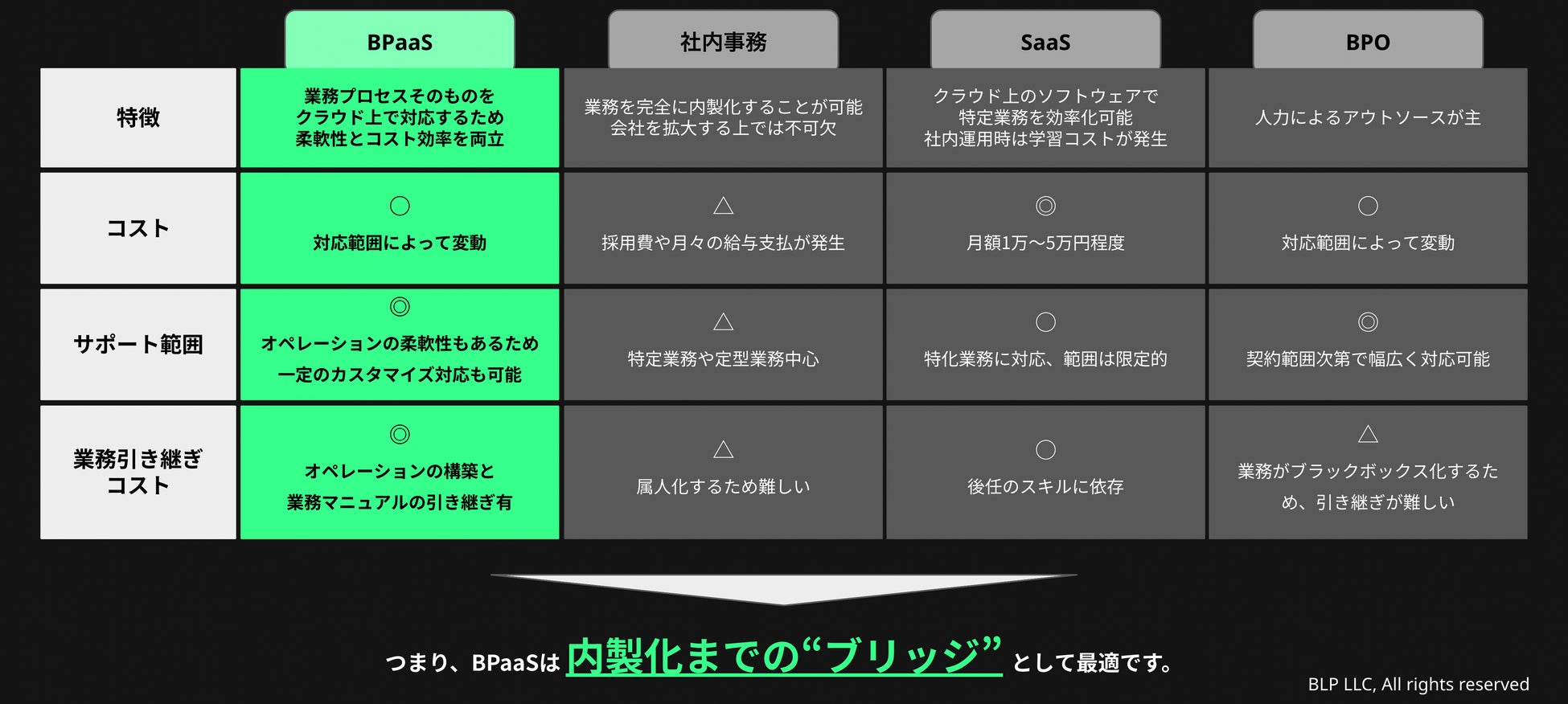 BPaaSは、社内事務、BPO、SaaSとよく比較されますが、それぞれのメリットを組み合わせたサービスです。