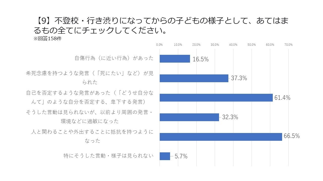 不登校の子ども達は、なんらかのストレス過多な環境で生活してきたことで心がズタボロの状態であることがあります。”自分を守るために”学校との距離をとる(=不登校)のですが、その逃げた先の”自宅でも安心して過ごせない”と、子どもは逃げ場がなくなってしまいます。不登校の子ども達の中に「死にたい」と言うようになる子がいるのは、そうした居場所がなくなってしまうことが起因していることが多いです。(約4割)