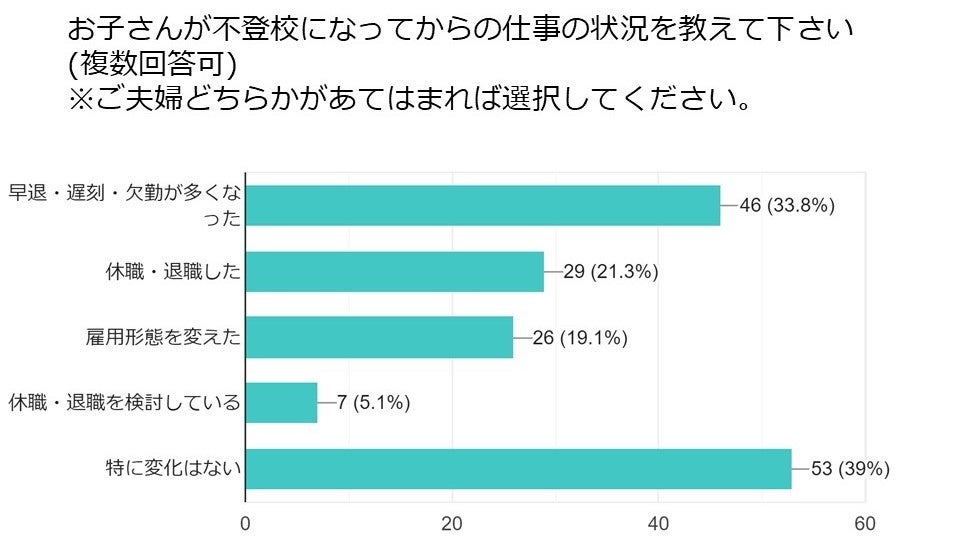 アンケートによると、子どもが不登校になってから「休職・退職した」が21.3%、「早退・遅刻・欠勤が多くなった」が33.8%、「雇用形態を変えた」が19.1%となっています。「休職・退職を検討している」の回答も含めると、不登校の子の保護者の61%が仕事・働き方への影響が出ていることがわかります。