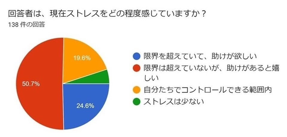 アンケートでは、保護者のストレス具合を確認する項目も設置しました。50.7%と全体の約半分が「限界を超えていないが、助けがあると嬉しい」と回答し、4人に1人(24.6%)が「限界を超えていて、助けが欲しい」と回答しています。全体の8割近くが、外部の助けを求めている状況です。