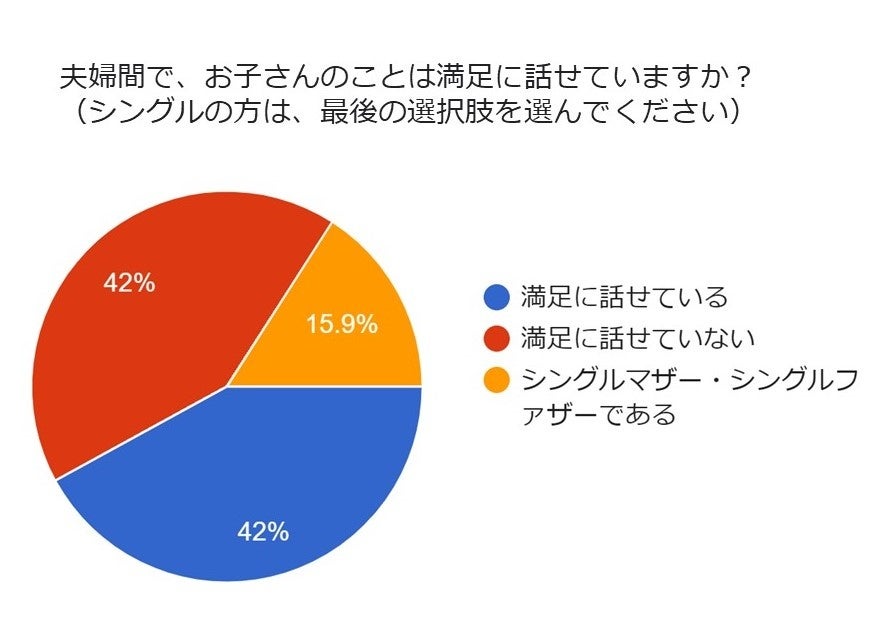 夫婦間で子どものことを満足に話せているかどうか質問をすると、「満足に話せていない」が42%、「シングルマザー・シングルファザーである(=そもそも家庭内で相談できる相手がいない)」が15.9%でした。半数以上の保護者が、家庭内でも相談できず、孤立してしまっていることがここからわかります。