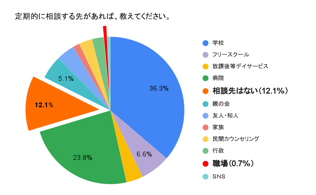 また「定期的に相談先があるか」という設問に対しての回答はグラフのようになっています。「相談先はない」と答えたのが12.1%となっており、家の中にも外にも行き場のない保護者もいることがわかります。「職場」と答えたのが0.7%となっており、仕事という形でつながりはあっったとしても、子どもの不登校のことについて職場内で相談することは難しいということがここからわかります。