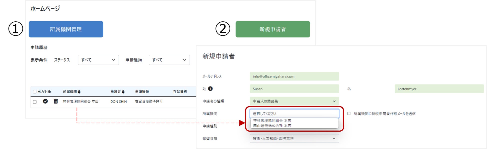 所属機関管理ボタンから顧客先の情報を登録します。新規申請者ボタンから申請者情報を登録します。申請者の所属する勤務先に先に登録した所属機関から選択をします。
