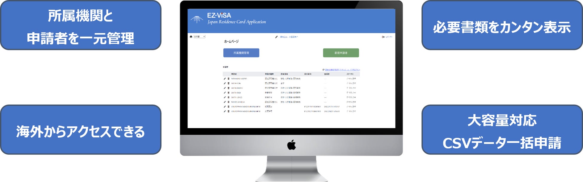 イージービザの特徴は、クラウド型データ管理オンラインシステムで、グローバルな環境に対応したシステムで、インターネット環境さえあれば、海外に住む外国人もアクセスができるオンラインシステムです。
