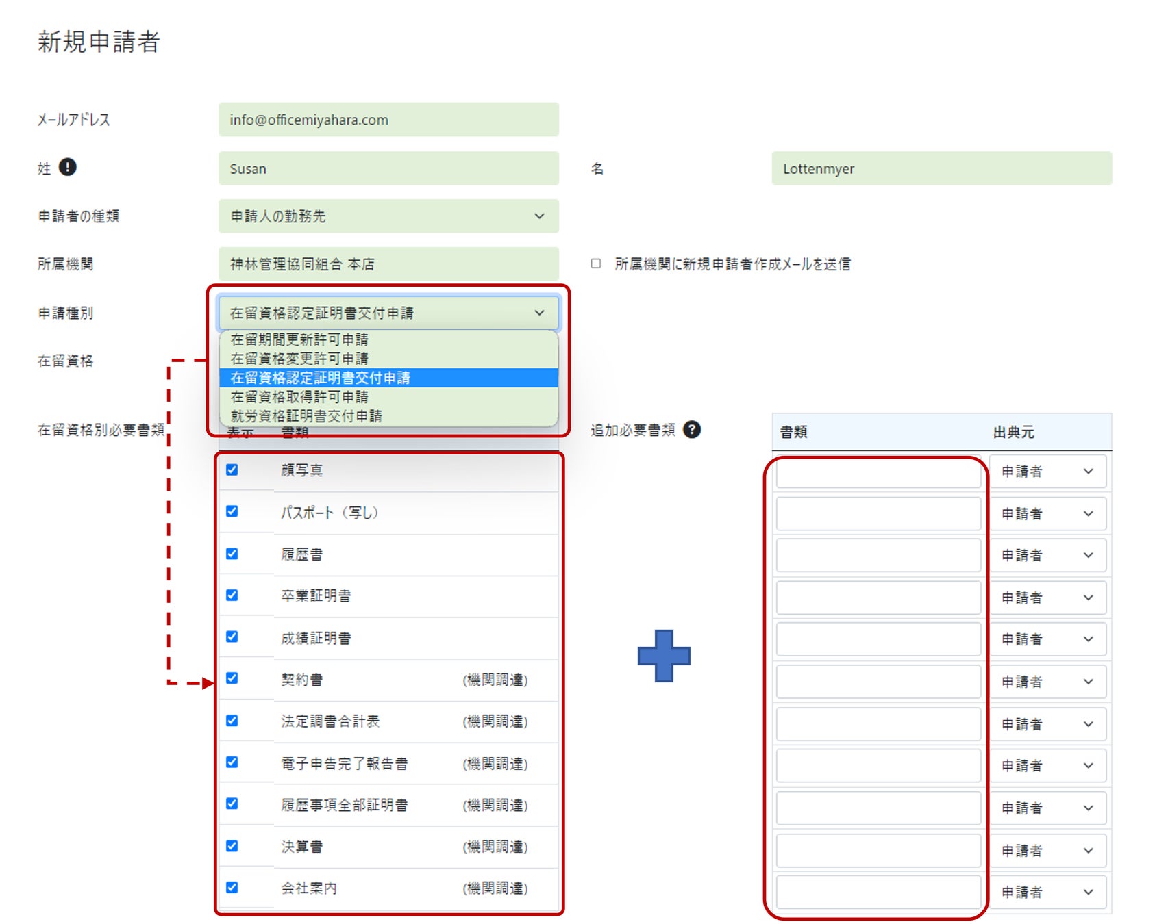 同じ在留種別を申請する場合でも、人によって提出書類は異なる場合もあり、チェックを外して変更ができ、追加書類が必要な場合は、自由に右側の欄に追加入力ができます。