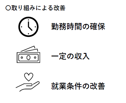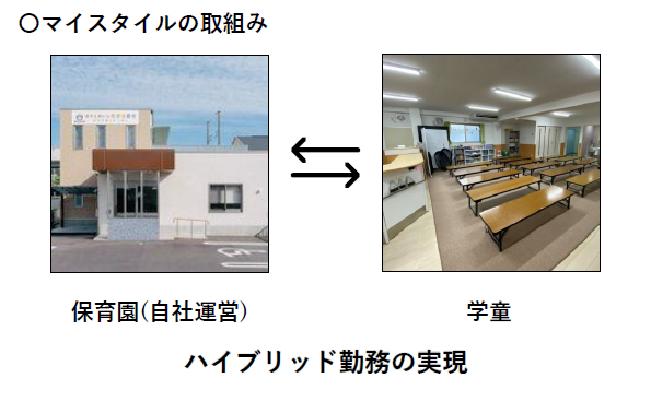 このような学童における働き方改善として、株式会社マイスタイルでは、学童が閉所している午前の時間帯を「保育園(自主運営)」にて、午後からの時間帯を「学童」にて就業する「ハイブリッド勤務」を導入した。これにより、兼ねてより学童施設が抱えていた、就業時間の確保とそれに伴う就業条件の改善及び一定の収入の確保が実現すると確信する。2023年4月以降、本人の意思に基づき、「保育園」と「学童」の2拠点にて就業している職員は4名在籍している。