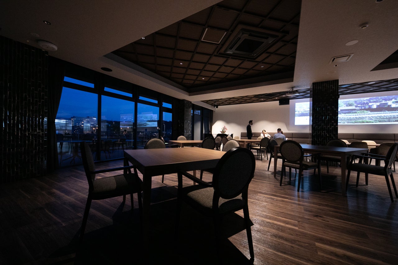 レストラン名は三日月を意味する「CRESCENT」と銘打ち、“希望”という意味も込められています。木のぬくもりに、大きな窓やテラス席からは人吉城址や球磨川を眼下に見下ろす開放感のある空間となっています。プロジェクターから壁に映し出される人吉の風景や歴史をお楽しみいただける他、テラス席では川の流れを愛でながらゆったりとお寛ぎいただけます。