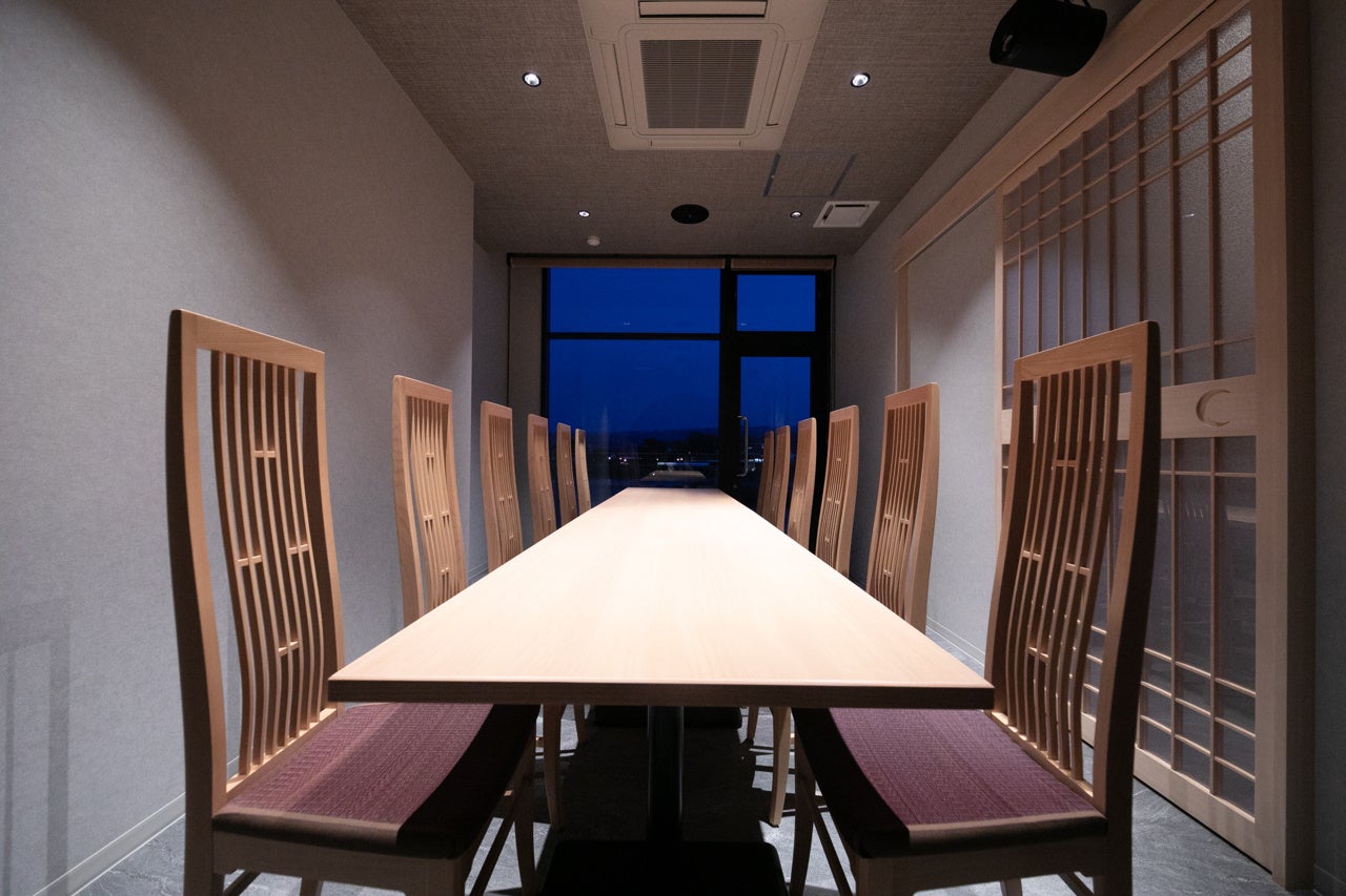 し、斬新な一皿へと仕上げます。シェフの富山は「球磨川の水害による復興を目指す人吉球磨の方々の想いを、料理を通して伝えたい」と述べています。なお、ダイニング、テラス席の他、個室もご用意しております。