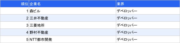デベロッパー業界では、1位森ビル、2位三井不動産、3位三菱地所、4位野村不動産、5位NTT都市開発といった結果になりました。三井不動産、三菱地所を抑えて、森ビルが1位となっております。