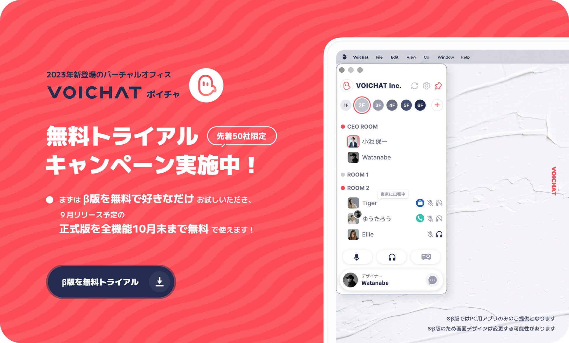 VOICHAT株式会社(代表取締役CEO:小路康丸)が提供する新感覚バーチャルオフィス「VOICHAT(ボイチャ)」は、2023年5月29日にVOICHATβ版をリリースし、多くのお客様に反響をいただいたことから、この度、追加でモニター企業を50社募集いたします。