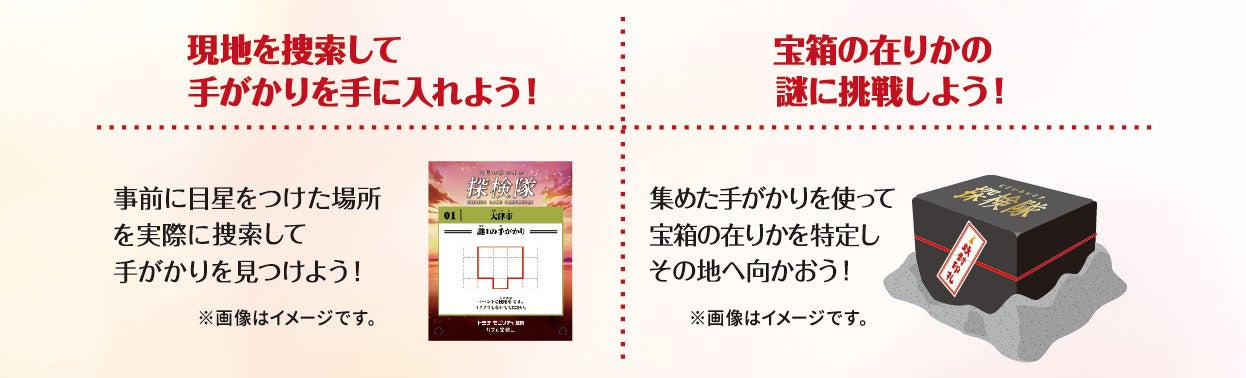 「宝箱」を発見したら中に書かれた「発見キーワード」を冊子にメモして、次のエリアの探検に向かいましょう!