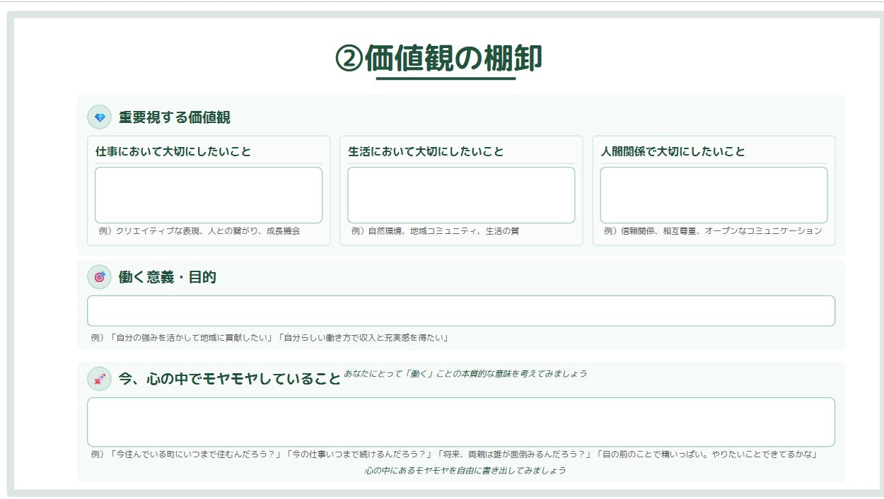 価値観/避けたいこと/大事にしたい関係性・働き方を整理し、シートを活用して言語化することで、今後の生き方の軸をつくる。