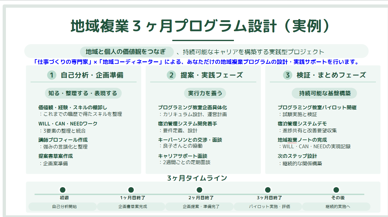本プログラムが重視するのは、短期の決断ではなく、自己納得に至るプロセスです。1泊2日は「キャリア再編集のための準備運動」として位置づけ、希望者はその後、3ヶ月伴走プランの検討に進むことができます。